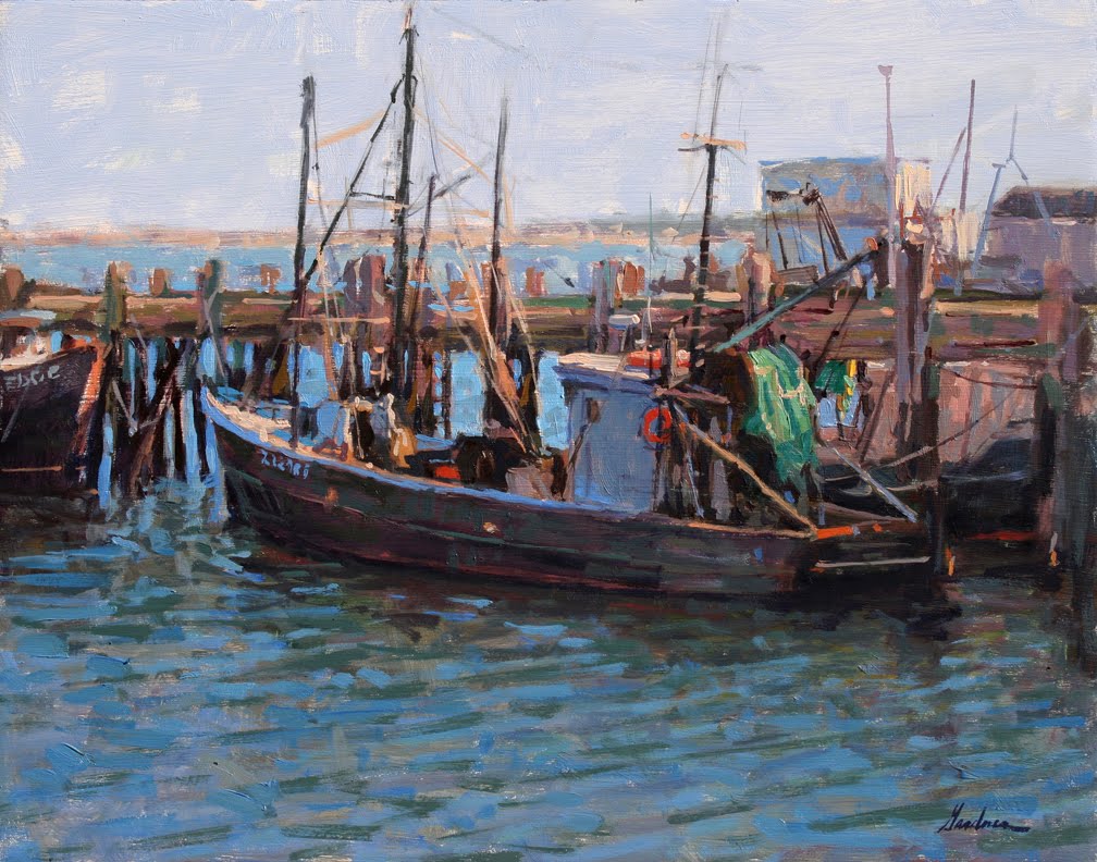 I concentrated on getting my design locked in first, then worked on painting the boat, pier and light and shadow while I could. The morning light falling on the green net and along the lines of the cabin and bow of the boat was what attracted me, so I wanted to make sure I got all of that down first. There was even a guy on deck working, so I added him in for a sense of scale and interest. I left most of the water, sky and background for later. I mixed up a few color notes for those areas while on the spot. Then used those reminders plus a photo reference to finish this one up after I got home.